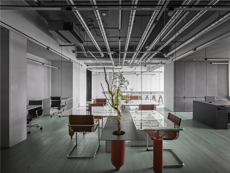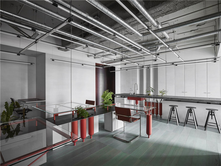 當(dāng)靈感關(guān)鍵抓緊"科學(xué)"而非"辦公室",設(shè)計(jì)師希望強(qiáng)化產(chǎn)業(yè)屬性里的科學(xué)基底,扭轉(zhuǎn)一般人對辦公室的刻板藍(lán)圖.回歸產(chǎn)品本身最貼近的實(shí)驗(yàn)室、工廠環(huán)境,日日可見的試管、生鐵黑鐵、氣體輸送管,以及包裝承載科技?xì)怏w的獨(dú)特鋼瓶,擷取生產(chǎn)鏈上再熟悉不過的材質(zhì)與造型,拆解轉(zhuǎn)換成辦公空間的結(jié)構(gòu)形體.