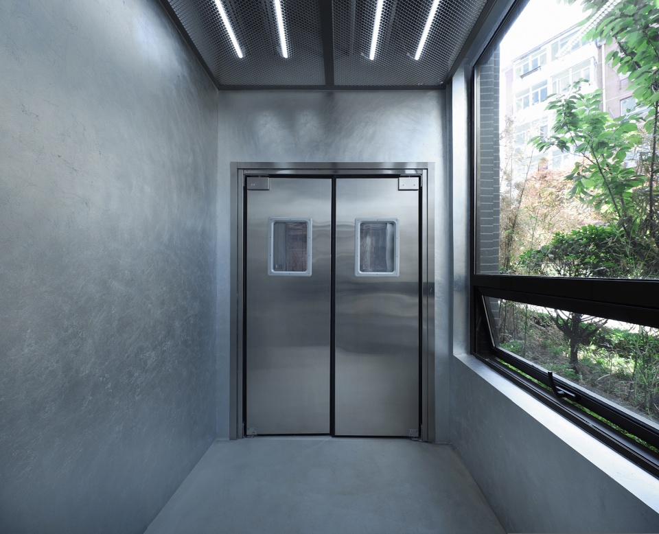 空間有兩個(gè)入口,主入口保證通行和展示,次入口則作為一個(gè)工廠的精神象征。設(shè)計(jì)師采用工廠車間金屬推拉門和防撞門作為工廠的大門,將粗獷銳利的工業(yè)感發(fā)揮到極致。前廳四壁貼有銀箔,作為對電影《Factory Girl》的致敬。
