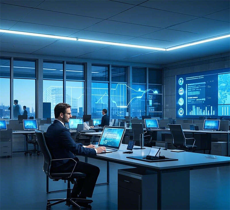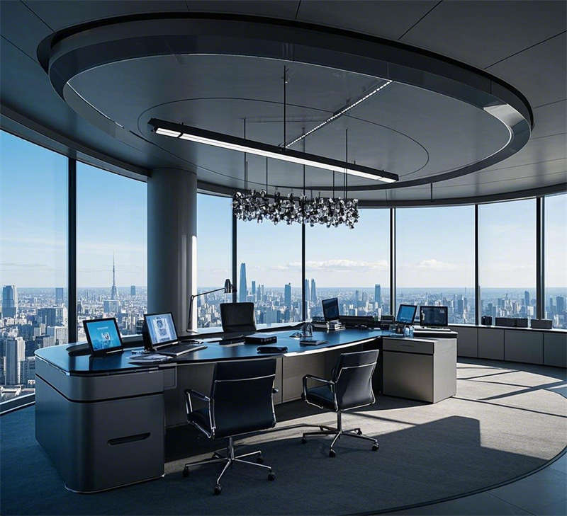 前臺(tái)接待室以懸浮式前臺(tái)和全息投影動(dòng)態(tài)logo為核心,金屬質(zhì)感墻面與燈光效果結(jié)合,營(yíng)造出未來之門的第一印象。敞開式辦公室通過數(shù)據(jù)流全息屏幕和智能辦公桌,打造高效協(xié)作的數(shù)字化辦公環(huán)境。經(jīng)理辦公室采用全景落地窗和智能辦公系統(tǒng),簡(jiǎn)約大氣,兼顧商務(wù)與舒適。總裁辦公室位于頂層,全景視野與奢華材質(zhì)相得益彰,藝術(shù)裝置彰顯領(lǐng)導(dǎo)風(fēng)范。