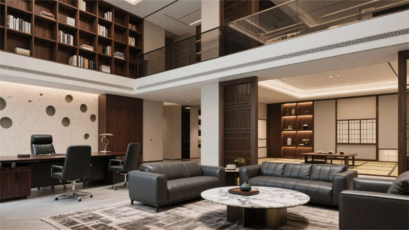 高管辦公區通過灰玻與豎向木紋鋁材構筑半私密空間,L型胡桃木辦公桌與深棕真皮座椅彰顯商務質感,獨立閱讀角的落地燈營造人文氛圍。總裁辦公室運用懸浮式書架墻與黑檀木辦公桌塑造權威感,環形皮革沙發組與天然大理石茶幾構成高端會客場景,日式茶室通過木格柵與洞石墻面實現東西方美學交融。