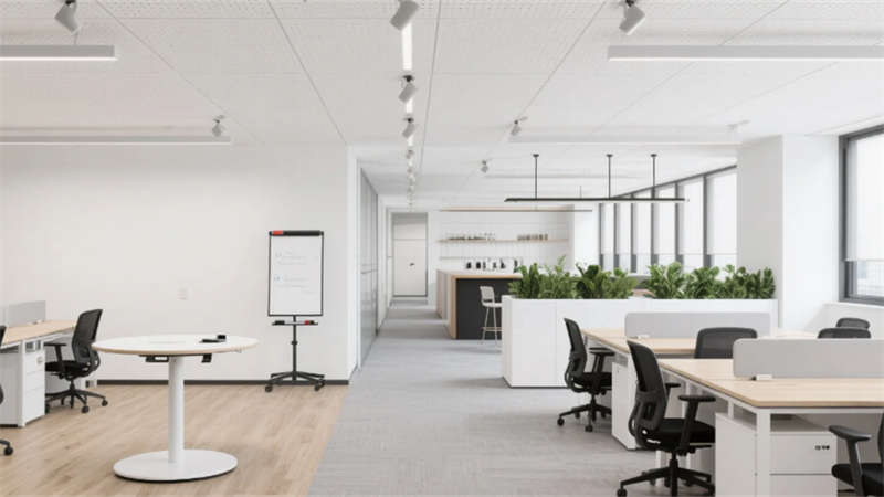 室內空間延續外立面設計語言,企業大堂通過技術創新實現淺白大理石與木紋墻面的無縫拼接,懸浮式線性燈光系統可隨自然光線智能調節色溫。開放式辦公區配置智慧化模塊組合,可升降桌體與軌道射燈靈活適配多元場景,協作島集成無線充電與環境感知功能。高管辦公室采用智能霧化玻璃隔斷,實現隱私與通透的自由切換。科技會議室搭載高清透明顯示系統與多聲道聲學設備,電動百葉簾與補光系統聯動打造智能會議環境。