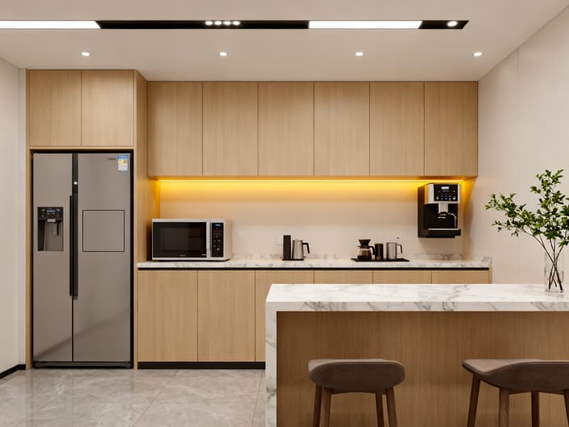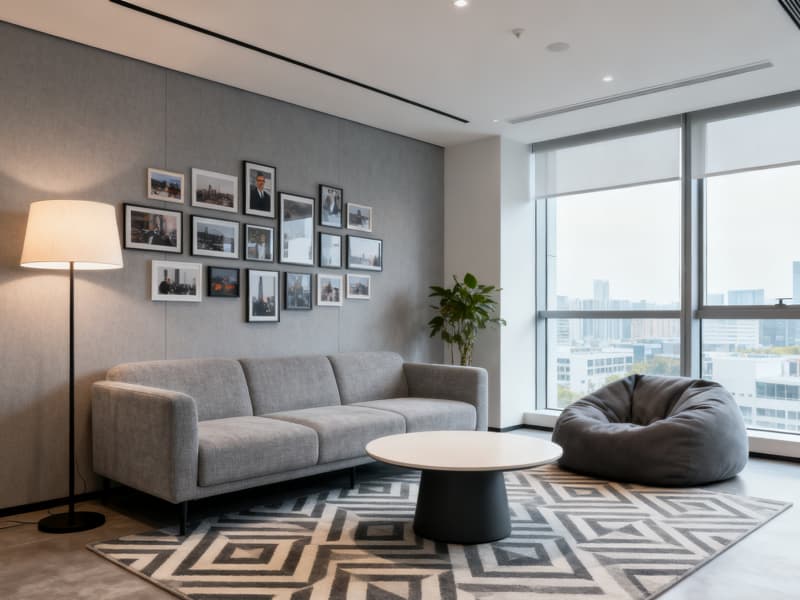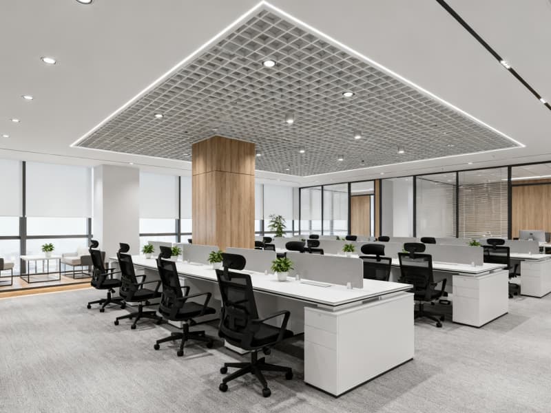 空間布局上,科學劃分接待區、開放辦公區、獨立辦公室、會議室、茶水間等功能區域,優化動線設計,保證辦公流程順暢。開放辦公區注重靈活性與協作性,模塊化家具與可移動隔斷適配不同工作場景;獨立辦公室與會議室強調私密性與專業性,通過材質與燈光營造專注氛圍;休閑茶水間與休息區則注重放松感,自然元素的融入緩解工作壓力,平衡工作與休息。