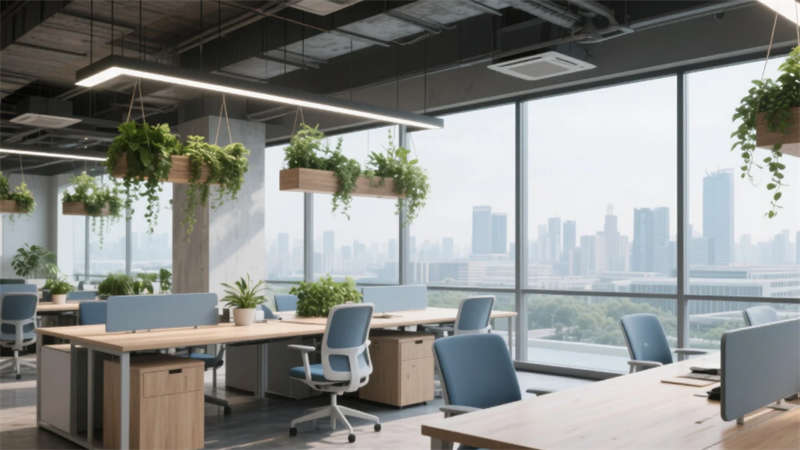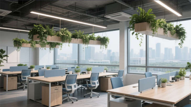 該辦公空間以"自然共生"為核心理念,將科技感與人文溫度融入兩千平米的開放場域。流動的淺木色調貫穿始終,啞光金屬與微水泥形成質感對話,模塊化家具構建靈活場景。綠植生態系統從空中吊籃蔓延至苔蘚墻面,模糊室內外界限。