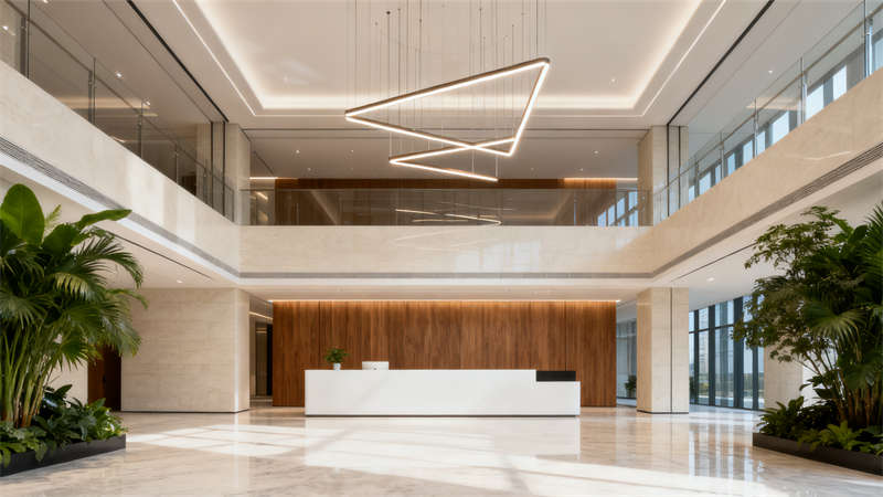 室內(nèi)空間設(shè)計(jì)從功能需求出發(fā),大堂采用挑高布局增強(qiáng)開闊感,大理石材質(zhì)的運(yùn)用提升空間格調(diào),藝術(shù)吊燈與綠植的搭配增添靈動氣息,營造出大氣且溫馨的入口氛圍。標(biāo)準(zhǔn)辦公區(qū)以開放式布局為主,合理的工位隔斷兼顧協(xié)作與隱私,柔和的條形燈帶提供舒適照明,助力高效辦公。?
