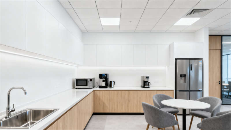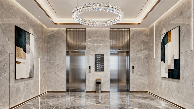 茶水間兼顧實(shí)用與休閑屬性,齊全的設(shè)備滿足日常需求,休閑桌椅的設(shè)置為員工提供放松空間。電梯廳延續(xù)整體簡約風(fēng)格,大理石材質(zhì)與裝飾畫、水晶吊燈的搭配,提升空間精致感,指示牌的清晰設(shè)置保障通行便捷。