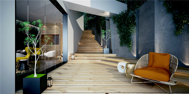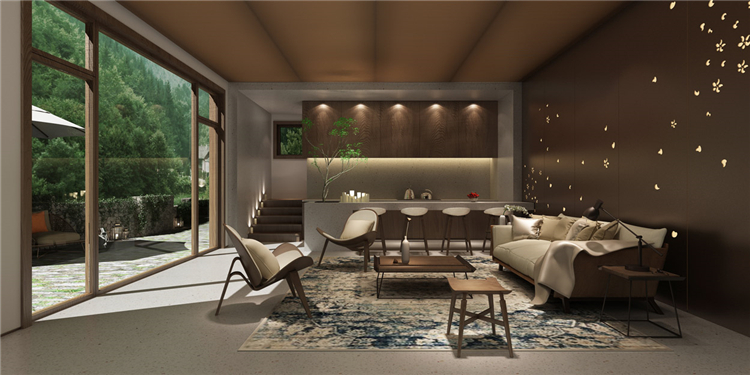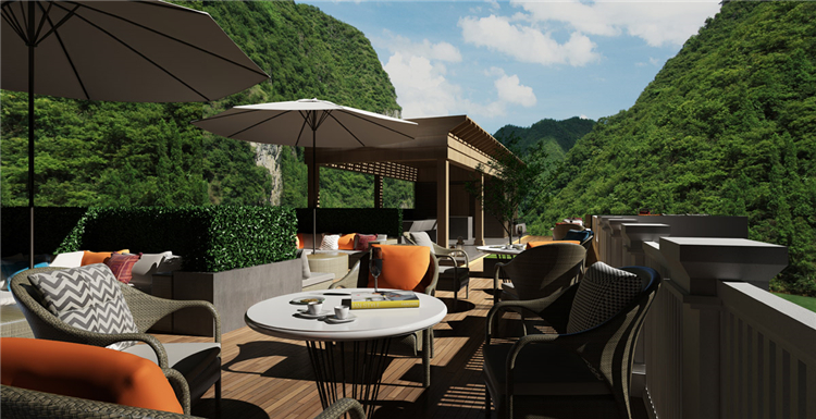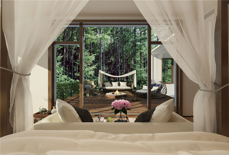 本案度假酒店設(shè)計依山傍水,設(shè)計師在規(guī)劃時,充分考慮到自然環(huán)境帶給酒店的附加值。設(shè)計方案時,設(shè)計師就將部分功能區(qū)規(guī)劃到室外露天場地,當(dāng)然在室內(nèi)設(shè)計中也充分利用了自然采光的設(shè)計手法,讓整個度假酒店與自然環(huán)境融為一體。