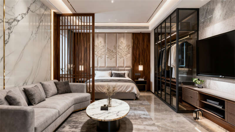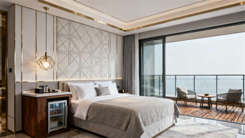 本設計以現(xiàn)代輕奢為核心風格,為蚌埠這家酒店打造出兼具質(zhì)感與溫度的居住體驗。整體空間以低飽和的米灰色系為基底,搭配胡桃木的溫潤與金屬線條的精致,構(gòu)建出統(tǒng)一且富有層次的視覺效果。?