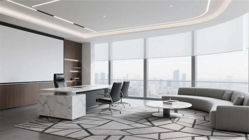 全案貫穿啞光金屬、木飾面與大理石材質細節,4000K中性光統一色溫,智能燈光系統提升能效。設計通過嚴謹的線條分割與人性化功能分區,實現美學與實用性的深度融合,重新定義現代辦公空間的品質標準。