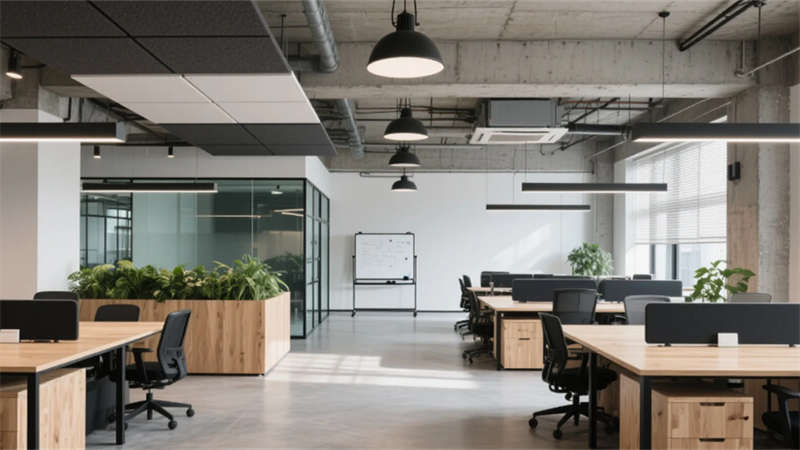步入大堂,粗獷的混凝土墻面與水磨石地面形成質(zhì)感對(duì)話,懸浮金屬網(wǎng)天花下,原木前臺(tái)與背光綠植墻暈染出溫潤(rùn)生命力。開(kāi)放式辦公區(qū)延續(xù)工業(yè)基調(diào),模塊化橡木桌搭配黑色鋼架,綠植隔斷巧妙劃分空間,自然光穿過(guò)智能遮陽(yáng)簾,在混凝土天花上投下流動(dòng)的光影詩(shī)行。