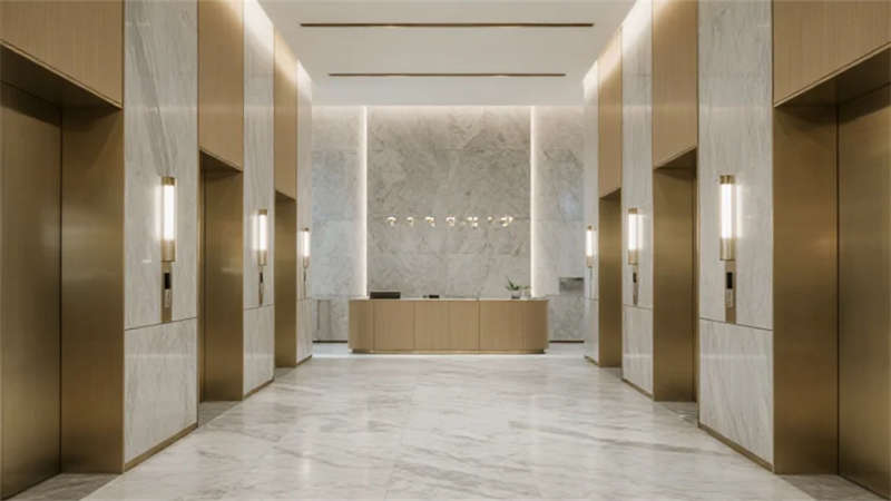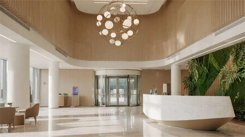 本設(shè)計以現(xiàn)代簡約美學重構(gòu)辦公空間本質(zhì),建筑外觀采用純凈的玻璃幕墻與幾何切割形體,在晝夜交替中演繹光與影的韻律。入口大廳通過挑高空間與弧形前臺營造開放包容的儀式感,綠植墻與球形燈具的點綴賦予空間自然生機。電梯間延續(xù)極簡語言,香檳金金屬與巖板材質(zhì)碰撞出低調(diào)質(zhì)感。
