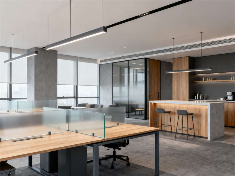 中型會(huì)議室圍繞協(xié)作功能展開,長條式會(huì)議桌與玻璃隔斷搭配,既保證空間開闊,又能與外部辦公區(qū)形成視覺聯(lián)動(dòng),灰色布藝座椅與頂部圓形吊燈呼應(yīng),讓會(huì)議場景兼具功能性與舒適感。茶水間則通過淺灰石英石臺(tái)面、木色護(hù)墻板與暖光燈帶,營造輕松休閑的氛圍,成為辦公間隙的放松節(jié)點(diǎn)。