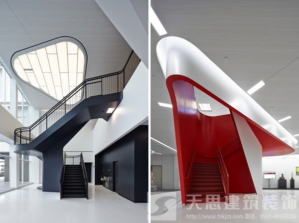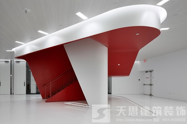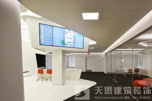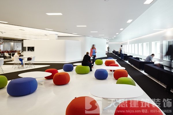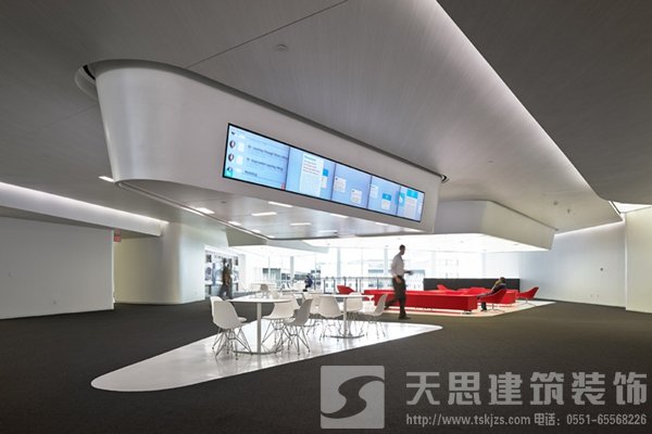 綜合大樓過渡區設計為開放式合作工作區域,傳統的理念通常認為這里和工作場所相比不是那么有用,但是很多富有成效的非正式的討論往往在這里誕生。每個工作中心都配有色彩鮮明的家具,頂部下方挑檐底面突出的吊頂造型內嵌LED顯示屏,不斷滾動播出最新信息,包括各種通知、員工和訪客新聞、各種公告、新聞事件以及全球3M公司員工信息。