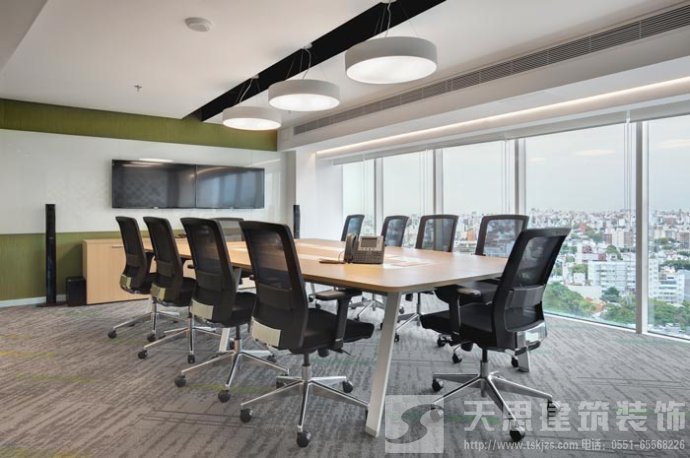 會議室的設計:設計師在設計的時候,將其安置在靠近窗戶的空間區(qū)域中,在設計師看來會議是企業(yè)發(fā)展所不可替的,但是設計師希望可以改變會議室給人枯燥、無味的感覺,故此設計師將采光、室外景色通過設計的手法將其引入室內(nèi),讓會議變得有趣起來。