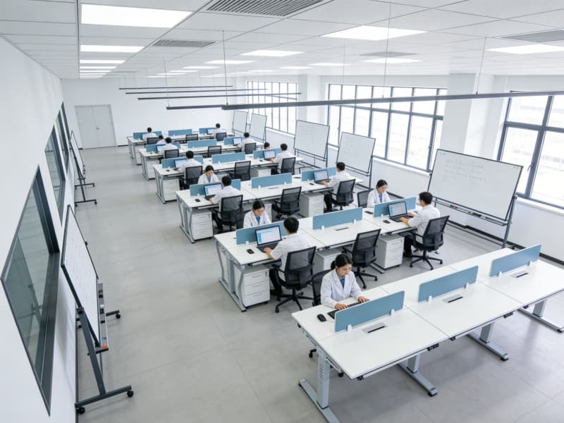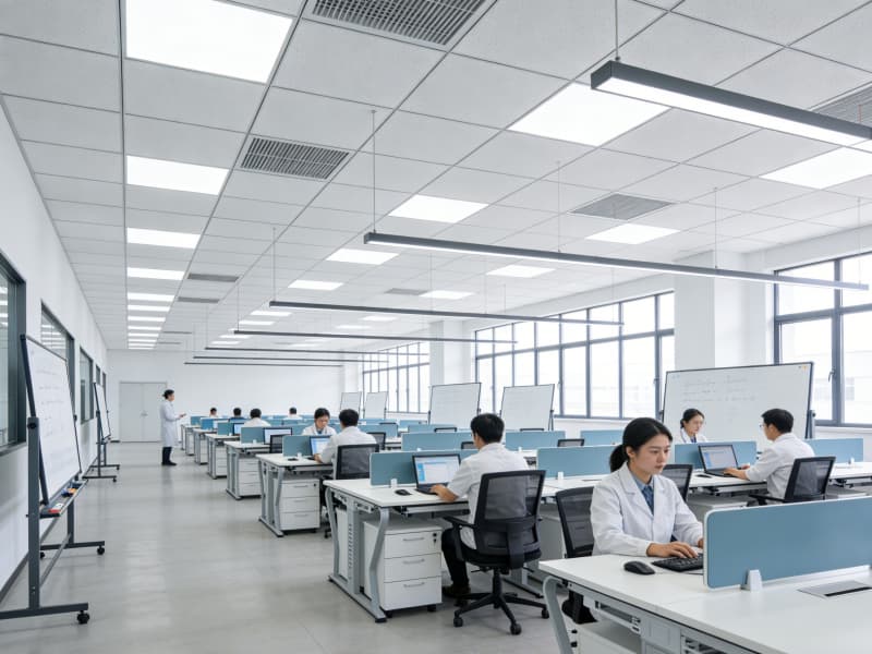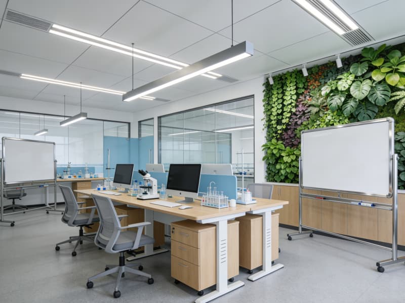 研發區營造舒適且富有創意的氛圍。開放式的辦公區域配備智能升降辦公桌與可移動白板,方便團隊交流與頭腦風暴。實驗室采用模塊化設計,實驗臺布局合理,各類先進儀器有序擺放。通風系統保證實驗環境安全,同時設置綠植墻,為科研人員舒緩壓力。
