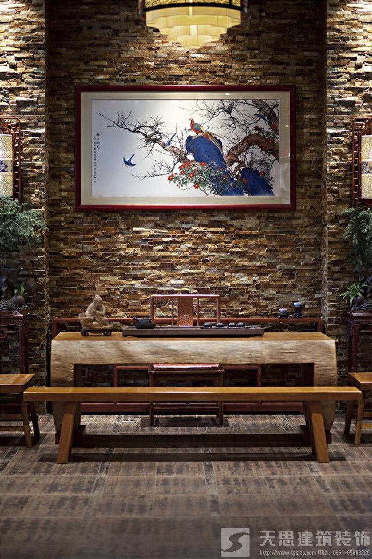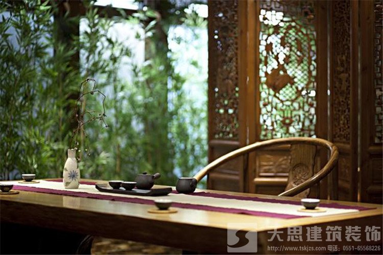 古典中式裝修茶樓會所空間裝飾有極強的設計感,高低錯落的掛畫與格柵窗落增加茶室的藝術美,原色原味的樹根茶幾集實用與欣賞一體,泡一杯清茶,就進入了一片碧綠的天空,這里將成為愛茶人士的最愛。