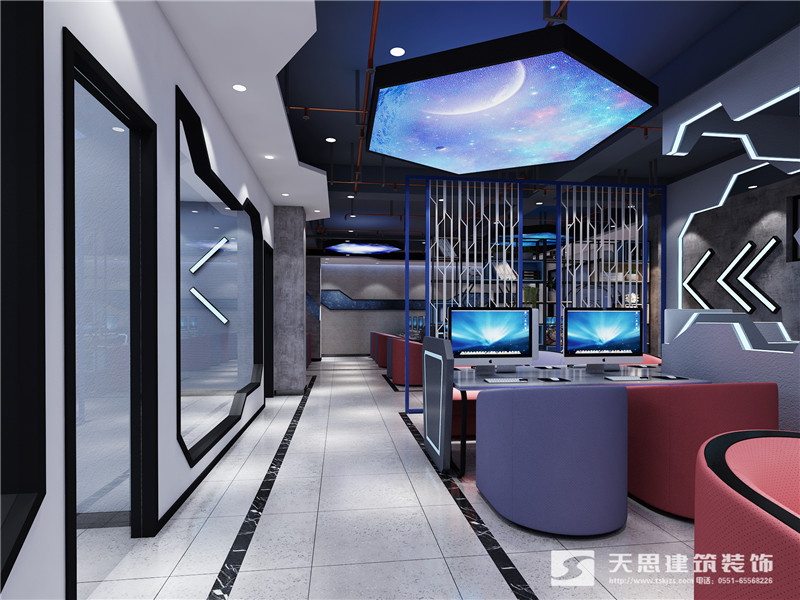 根據(jù)業(yè)主的要求,網(wǎng)咖設(shè)計(jì)的整體顏色以淺色為主,中間穿插對(duì)比強(qiáng)烈的撞色系來展現(xiàn)效果。