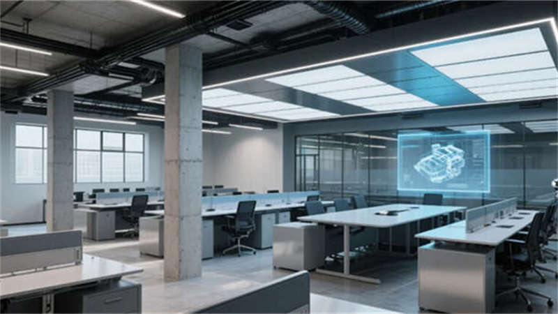 核心生產區以灰調環氧樹脂地坪為基底,大型CNC加工中心與智能機械臂組成“U”型產線,頂部集成黃色安全標識的橋式起重機軌道,配合藍光焊接機器人動態光軌,形成極具未來感的工業圖景。辦公區突破傳統廠房設計,通過混凝土肌理墻面、懸浮式玻璃會議艙及企業色聲學模塊,構建開放互聯的智慧管理中樞。