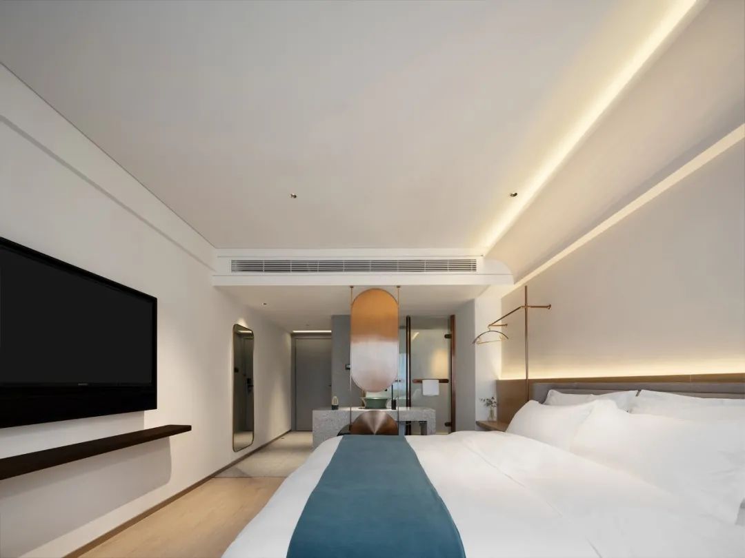 在線條曲度與建筑結(jié)構(gòu)的銜接中交融出感性層面的驚喜,令入住者“循著光”下榻酒店,在體驗(yàn)與感受中為空間注入當(dāng)下的即時(shí)形態(tài),由此,人在空間里是造訪者亦是著境者,是觀賞者,亦是參與者。情與境中,無盡遐思。