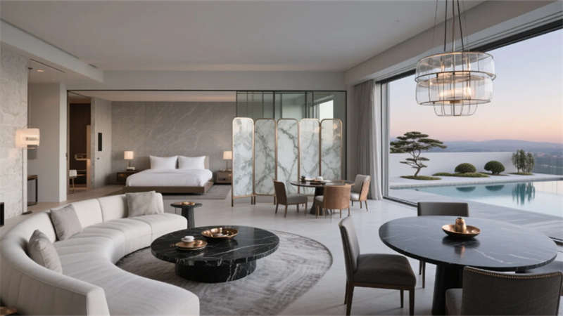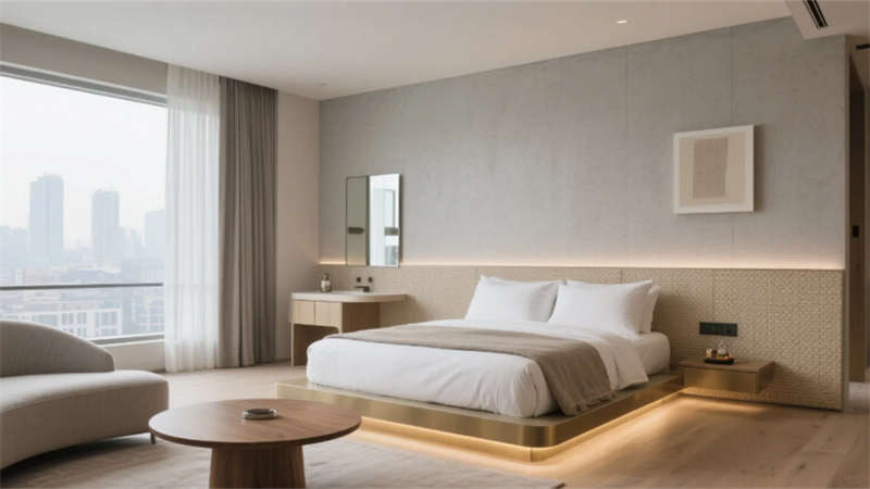 步入挑高的大堂,原木與石材的碰撞詮釋著質樸的高級感。懸浮玻璃樓梯如透明絲帶盤旋而上,紙藝褶皺吊燈灑下柔和光暈,綠植墻在隱藏式燈光中若隱若現,仿若一幅當代山水畫卷。客房以暖灰與米白為基調,亞麻、微水泥與天然木紋織就療愈氛圍,弧形沙發與嵌入式燈帶讓空間流動著溫柔詩意,落地窗將城市天際線化為朦朧背景。