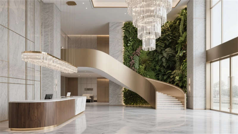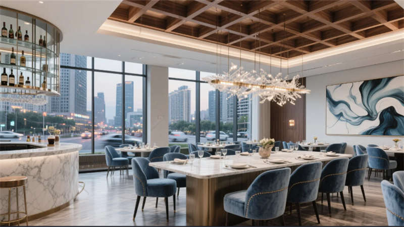 步入挑高大廳,懸浮水晶燈傾瀉柔光,旋轉樓梯以雕塑形態定格動態美學,綠植墻與大理石的對撞詮釋自然與精致的共生。全日餐廳借落地窗框景四季,絲絨餐椅與光影交織出慵懶的晨昏;行政酒廊夜幕降臨時化身空中藝廊,星空天花與城市燈火共舞,霧化玻璃切換著商務與私享的邊界。