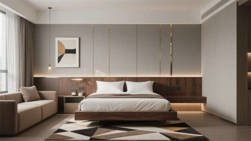 以低飽和度中性色調為基底,這座酒店將現代輕奢美學與在地文化氣韻悄然相融??臻g以胡桃木的溫潤、金屬線條的利落與自然光影的詩意共筑視覺語言,藝術裝置如隱形的敘事者串聯起流動的場域精神。