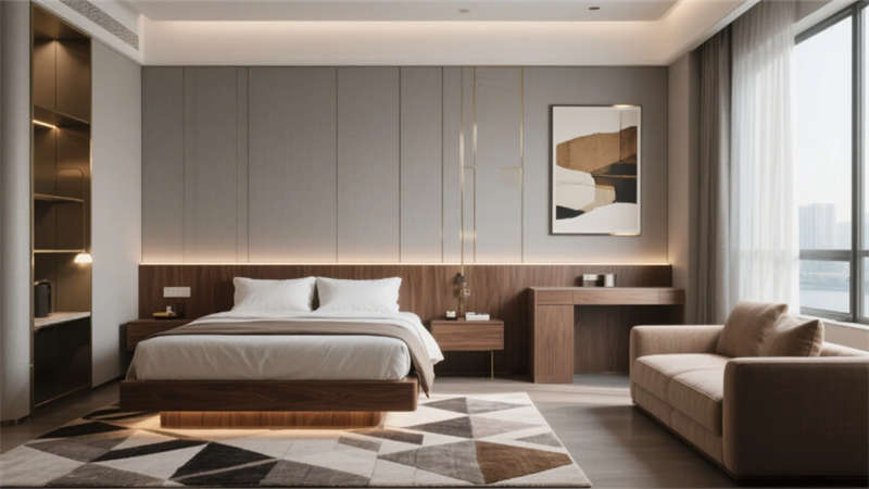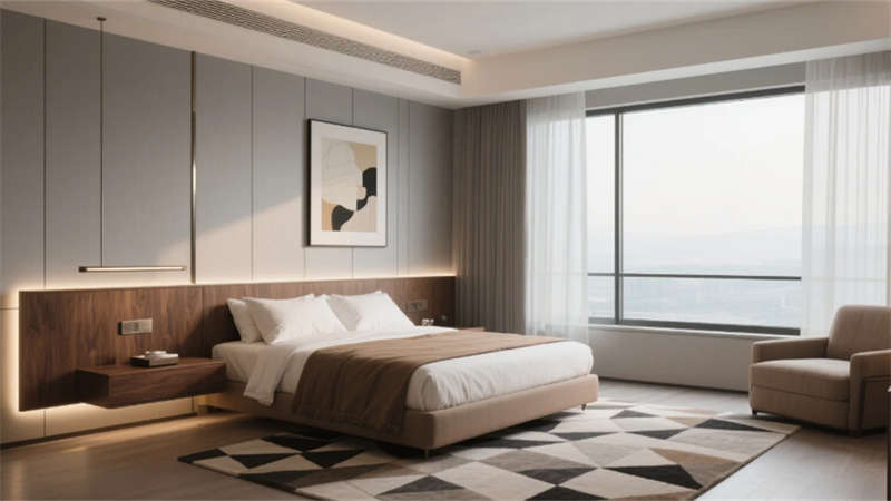 客房以大地色系織就寧靜私語,懸浮床頭背景墻暗藏柔光,紗簾濾過的天光與幾何地毯共譜空間韻律??罩杏境匾詿o界視野消弭建筑與城市的距離,水下燈光隨波紋搖曳成流動藝術;洞穴風SPA空間用微水泥曲面與枯山水庭院,重構身心的歸隱儀式。