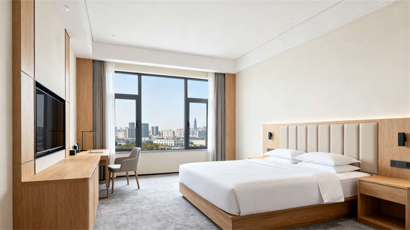 客房設計注重舒適與便捷,整體風格延續簡約風,家具選擇線條簡潔的款式,軟裝搭配以柔和的色彩為主,營造出寧靜放松的休憩環境,同時兼顧收納功能,讓客房空間整潔有序。?