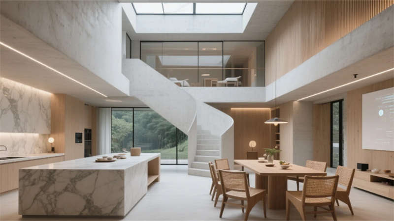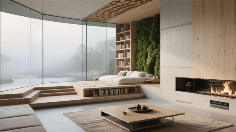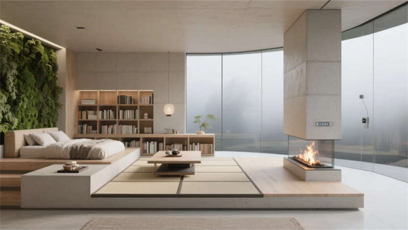 客房以極簡的智慧回應棲居本質。榻榻米地臺消弭床與地面的界限,270°環景霧化玻璃輕觸即透,仿生綠植在智能光影中呼吸生長,隱藏式投影幕布落下時,星空與林海皆成私享背景。階梯書吧的垂直綠植墻下,模塊化沙發隨需求自由組合,全息粒子在空氣中勾勒出流動的藝術,而巖板中島餐廳里,藤編座椅與吊燈矩陣的光暈交織,智能調光天窗讓每一餐都浸染著天光的溫度。
