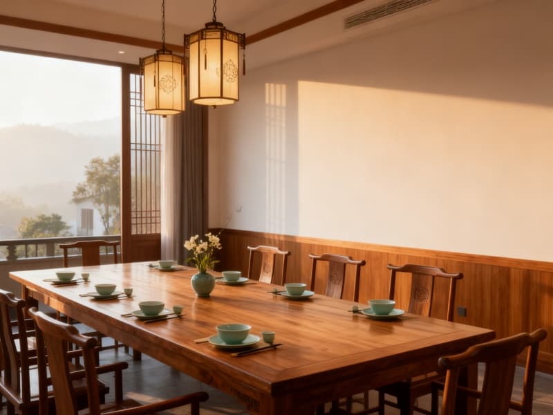 室內(nèi)空間借由廣角鏡頭可感知的通透布局,讓原木紋理成為空間的重要語言。公共區(qū)域的桌椅、隔斷均選用帶有自然木紋的實木材質(zhì),搭配淺色系軟裝,清晨的光線透過窗欞灑入,在木紋上形成柔和的光影,增添空間的層次感。客房設(shè)計注重細(xì)節(jié),床頭背景墻以簡約的中式紋樣點綴,床品選用素雅色調(diào),與原木家具呼應(yīng),營造出安穩(wěn)休憩的氛圍。?