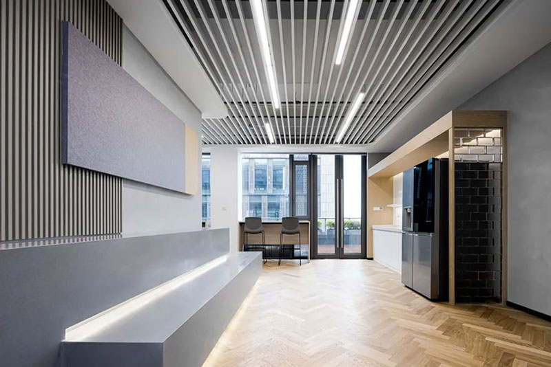 開放工位的造型吊頂與地面色塊相互呼應,輕松有趣的氣質穿梭在人員協作之間,中性色彩辦公家具在細節上增加耐用和降低視覺刺激導致的疲勞感。真正舒適的空間做到與功能需求一致,提供給使用者專心的設施和敏捷的思路。