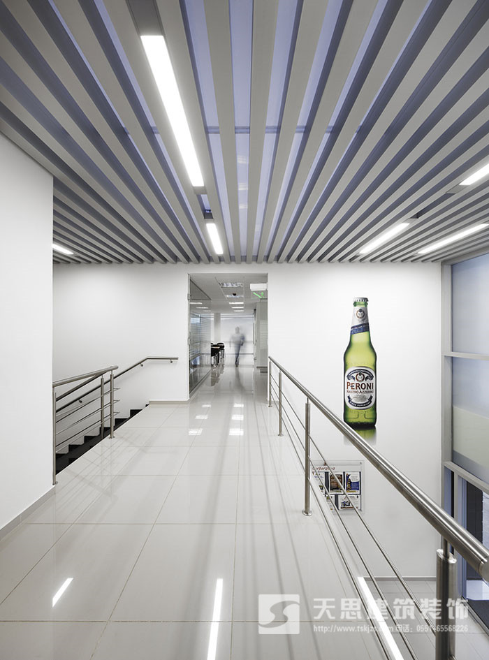 過道好似云梯,潔白的空間給人一種別樣的感覺,讓空間不在單調(diào),大大的啤酒瓶鑲嵌在空間的白墻上,既做為點綴,同時也作為企業(yè)的品牌宣傳。