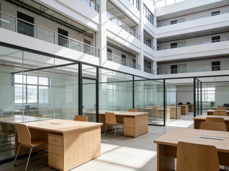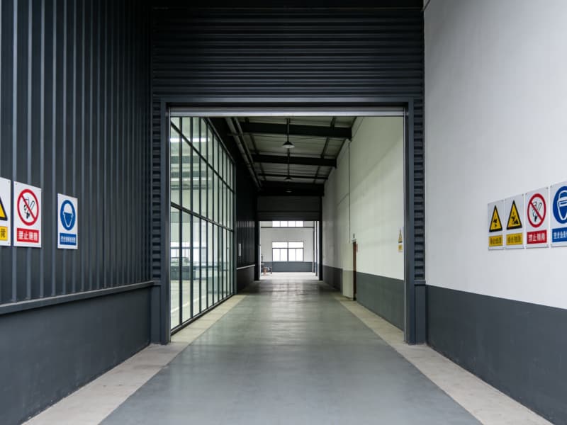 進入廠房內(nèi)部,生產(chǎn)區(qū)域挑高設(shè)計,空間開闊,頂部的桁架結(jié)構(gòu)裸露在外,搭配軌道式吊燈,營造出強烈的工業(yè)氛圍。地面選用耐磨的金剛砂地坪,承載能力強且便于清潔,滿足高強度生產(chǎn)需求。