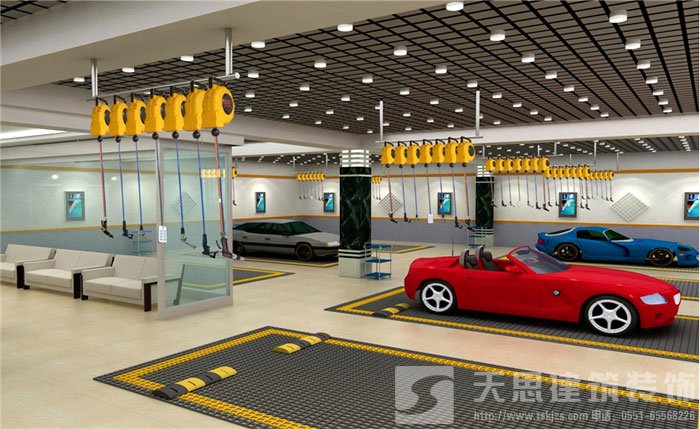 汽車(chē)美容工位是汽車(chē)美容店的客戶車(chē)輛進(jìn)行施工的場(chǎng)所,因此在這里裝修要盡量考慮水電氣股的吊放,可以兩個(gè)車(chē)位公用一個(gè)水電氣股,節(jié)省成本。