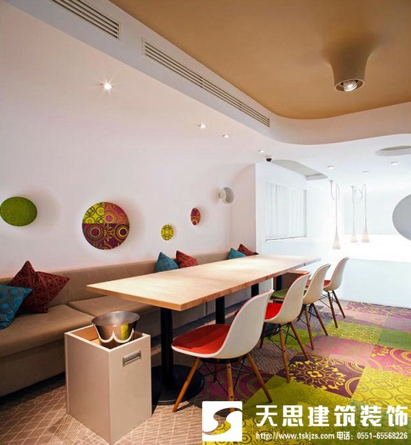 餐廳裝修效果圖,我們也隨之回到了現代,彩色地板與彩色桌椅相互呼應,個性鮮艷,讓整個餐飲空間充滿著活躍之感,被更為細致的刻畫并且賦予時尚的裝修設計造型與鮮艷的顏色。薄薄的桌面纖細在桌腳,現代工藝使木頭也有不小的改變。