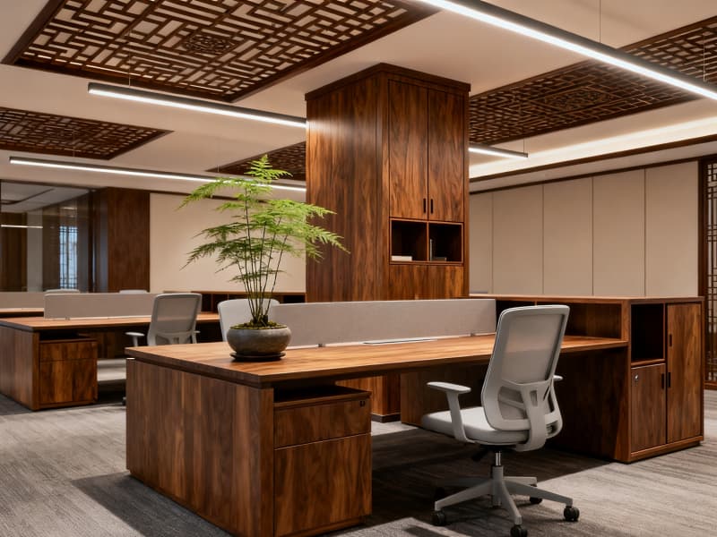空間布局上,科學劃分開放辦公區、獨立辦公室、會議室、休閑區等功能區域,優化動線設計,保證辦公效率與使用舒適度。色彩以淺色系為基底,搭配深棕色實木元素,營造雅致、沉穩的視覺效果,同時通過落地玻璃窗、中式格柵吊燈等設計引入充足自然光線,減少空間壓抑感。