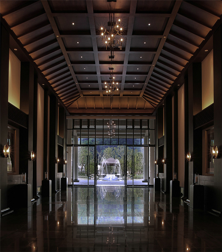 走入大堂,室內空間寬闊,天花鱗次櫛比通向樓梯方向,墻面灰色石材雕刻,將桃花源記中的詩句映入客人眼簾,禪境古意撲面而來。鏤空屏風隔墻的設計,讓空間隔而不斷,與具有傳統韻味的家具和配飾相互交融,打斷俗世的紛擾。柱子和天花上的裝飾燈具,利用金屬和木材兩種截然不同的材料和質地,創造空間內在張力,透過銳利的金屬、細膩的木質線條強調空間結構,精致筆挺的吊燈,令空間由內向外展現獨特魅力。
