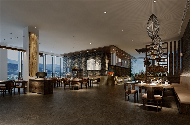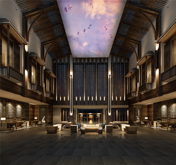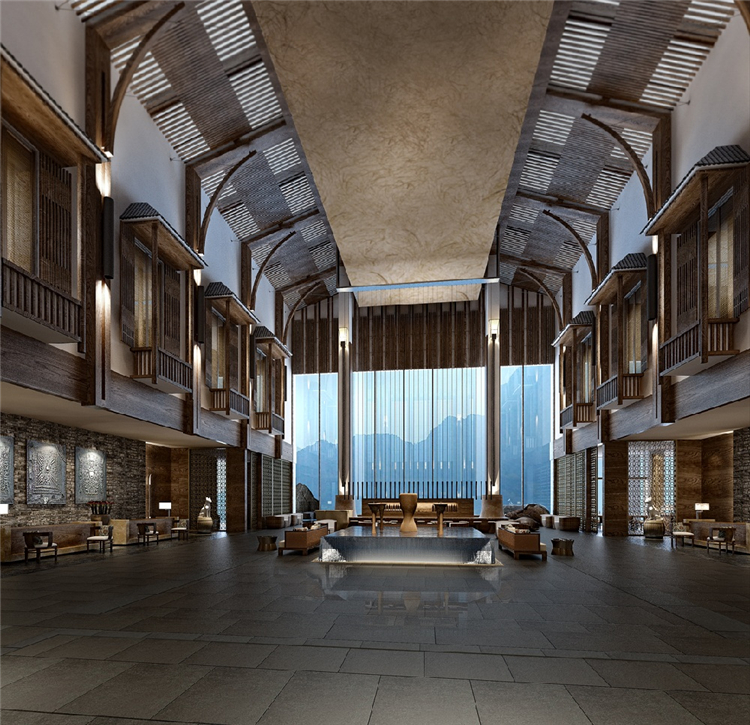 本案度假酒店的室內設計靈感來自于瑤族民居的生活態(tài)度,并結合對大自然的尊重,運用天然素材以當代風格重新演繹傳統(tǒng)設計。山水表現“瑤美”,鼓火表現"瑤情”,圖騰犬則表現“瑤魂”。以盛大的篙火晚會為藍本。融入舞臺和展示空間的概念。以此增加戲劇化效果。提升賓客對空間的精神感知。