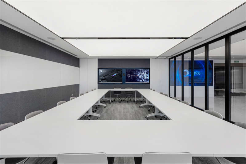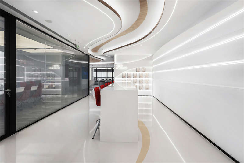 整個空間呈現出輕盈的姿態,大面積留白給予空間呼吸感,曲線流動的造型就像一根善于變化而纖細不驚的絲線,即將牽引出一次次關于未來的探索。