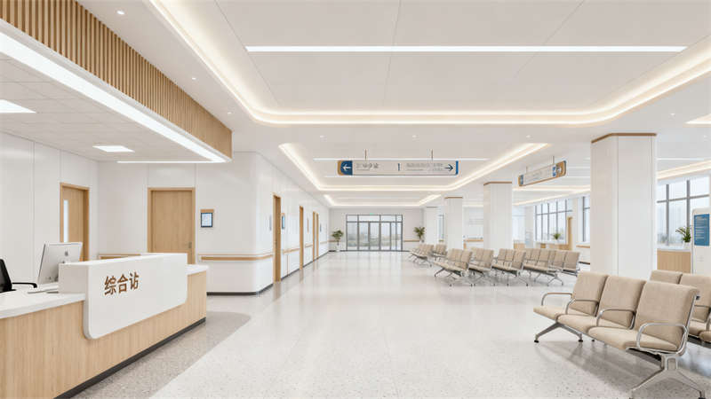 室內空間在保持風格統一的同時,兼顧不同區域的功能特性。門診區域動線清晰,布局合理,避免患者往返奔波,墻面以柔和的色調為主,搭配簡約的裝飾元素,營造清爽有序的環境;候診區融入自然元素,柔和的燈光、舒適的座椅與綠植點綴相得益彰,有效緩解患者等待時的煩躁情緒;病房空間注重私密性與舒適性,軟裝選擇以溫馨色調為主,家具擺放兼顧實用與便捷,讓患者仿佛置身“家一般”的休憩環境,助力康復;診療室與護士站強調高效與便捷,合理的功能分區讓醫護工作更順暢,同時通過親切的設計細節拉近與患者的距離;康復區域與走廊設計延續溫潤風格,避免生硬的空間劃分,通過連貫的視覺元素讓整個醫院空間形成有機整體,既方便患者活動,又讓醫護工作更高效,真正實現“以患者為中心”的設計初衷,讓醫療空間不僅具備診療功能,更成為助力身心康復的療愈場所。