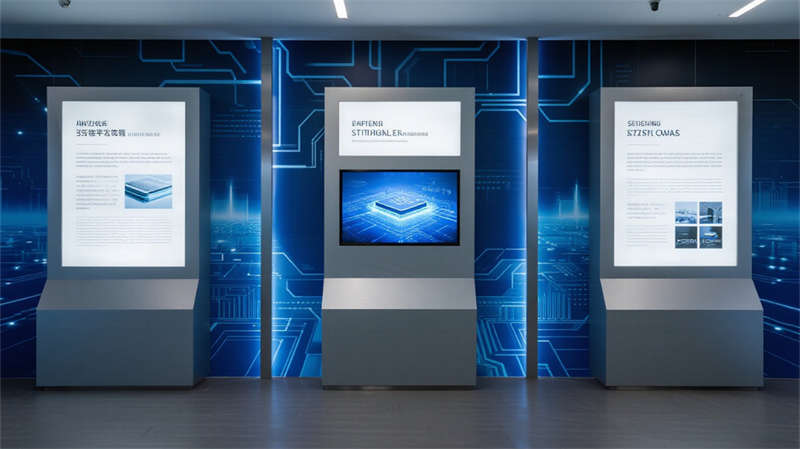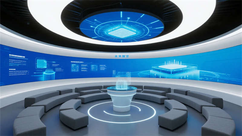 該半導體企業展廳以現代簡約風格為核心,通過流暢空間布局與高科技元素,打造沉浸式科技體驗。設計突出半導體技術的抽象表達,利用藍色與灰色調營造冷靜、專業的氛圍,同時融入玻璃、金屬材質增強通透感。入口區以懸浮雕塑引導視線,產品展示區通過簡約玻璃柜和觸屏互動,生動呈現技術精髓;技術創新墻以動態圖文展現工藝演進,歷史廊道則以線性敘事喚起行業記憶。互動區和未來展望區強調參與性,采用環形屏幕與全息投影,讓訪客直觀感受創新應用。休息區與演講區注重人性化,簡約家具結合微光紋理,提供舒適交流空間。整體設計摒棄繁復裝飾,以干凈線條和光影變化強化空間流動性,不僅傳遞半導體領域的精密與前瞻性,更通過美學融合提升教育性和觀賞性。展廳作為科技展示平臺,旨在激發探索興趣,體現企業對創新文化的重視。